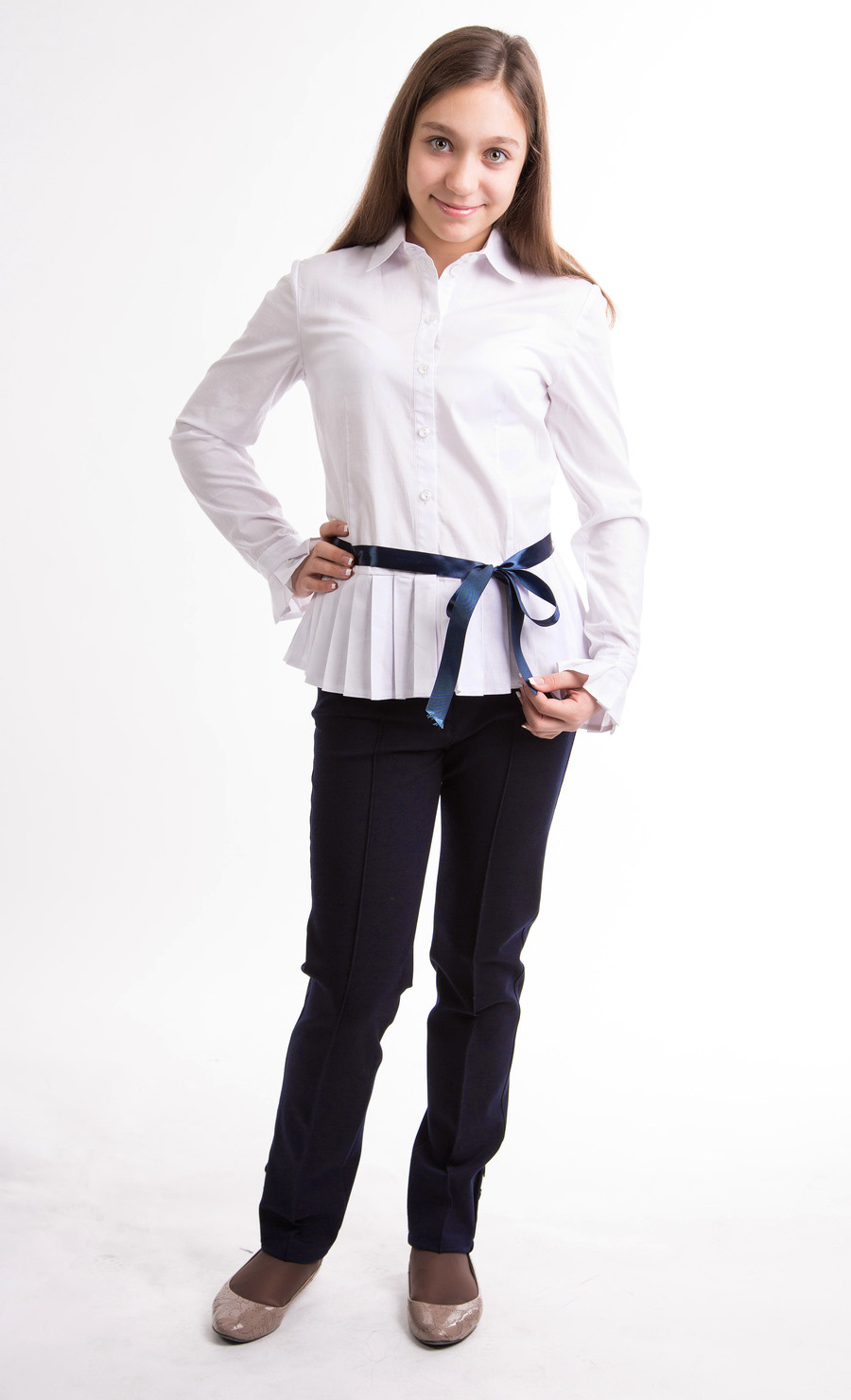 Блузка с длинным рукавом, с баской. Украшена атласным пояском.