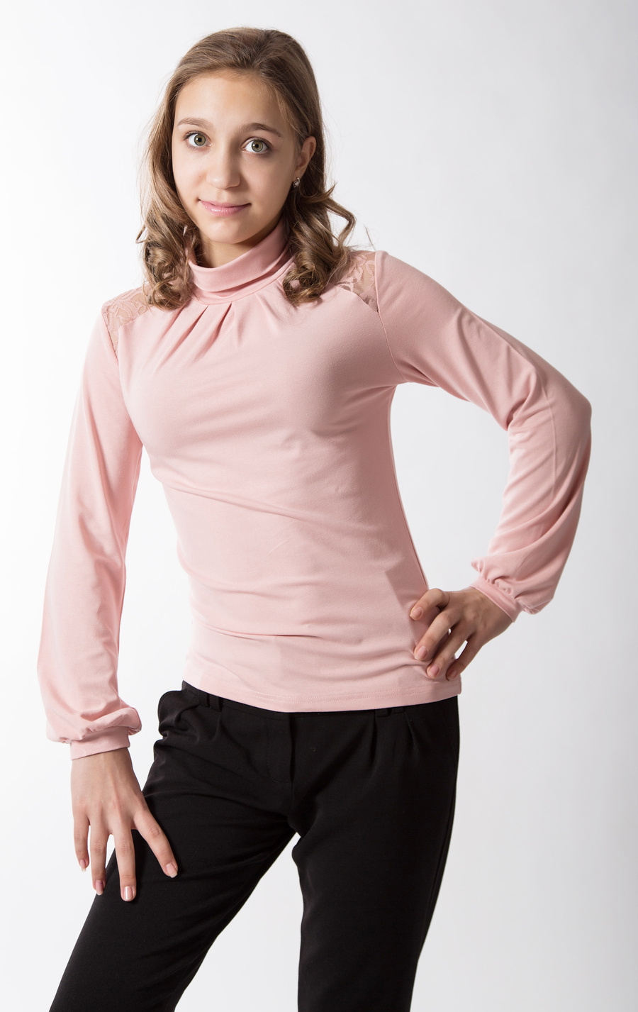 Водолазка сдлинным рукавом, украшена гипюровыми кокетками на плечах